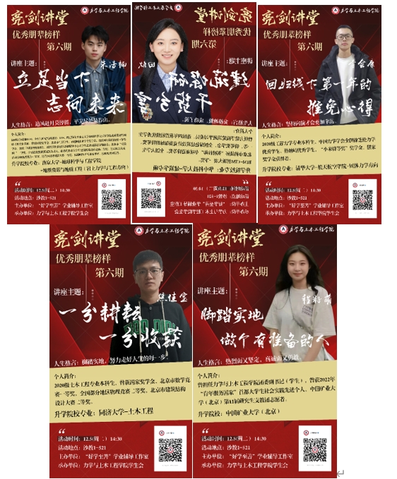 他们分别是升学至南京大学地球科学与工程学院地质资源与地质工程专业(岩土力学与工程方向)的朱浩楠、升学至华中科技大学建筑学的田欣、升学至清华大学航空航天学院固体力学方向的李会康、升学至同济大学土木工程专业的焦佳宝、升学至中国矿业大学(北京)的程籽萌。