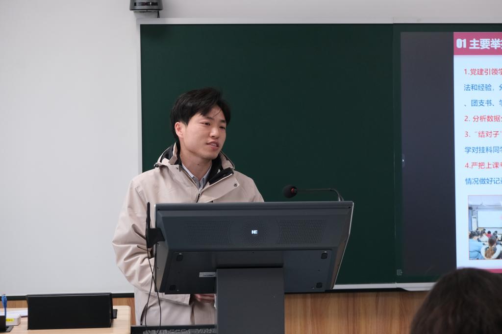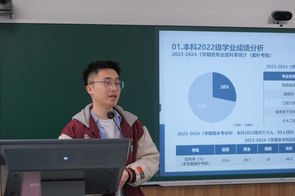 学院办公室主任、“好学至善”学业辅导工作室负责人何芬为学院学风建设情况做出了分析报告。她详细分析学院2021-2024年考研升学数据,指出应引导学生自主思考未来方向,提高学生的内生动力。各年级本科生辅导员对依次对本年级学习情况进行了汇报,详细说明了各年级、班级的挂科率、四六级通过率等情况,指出学生学习积极性不高、学习态度不端正等问题,并将对挂科门数较多的同学采取针对性解决方案,帮助学生提高成绩,降低挂科率。